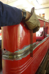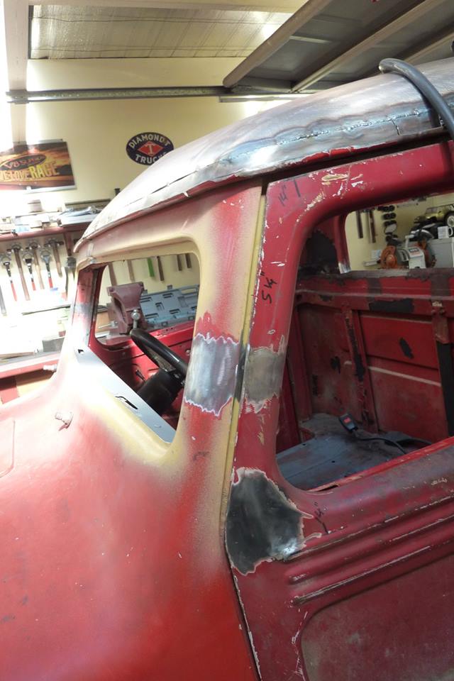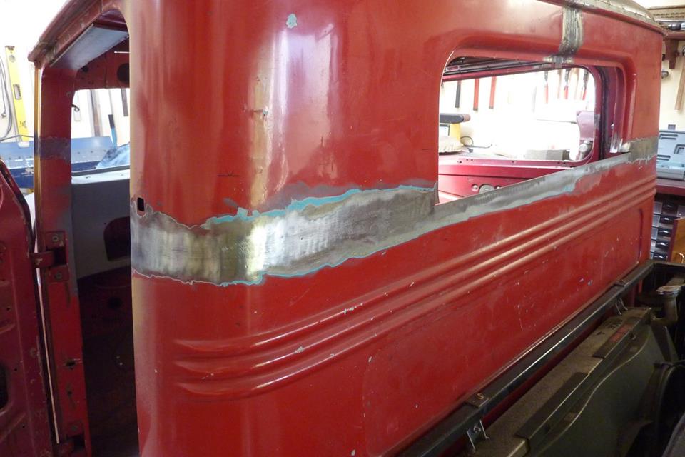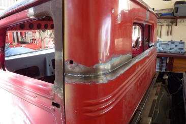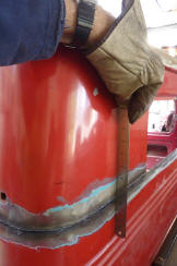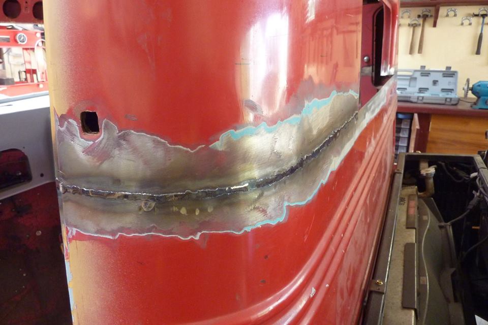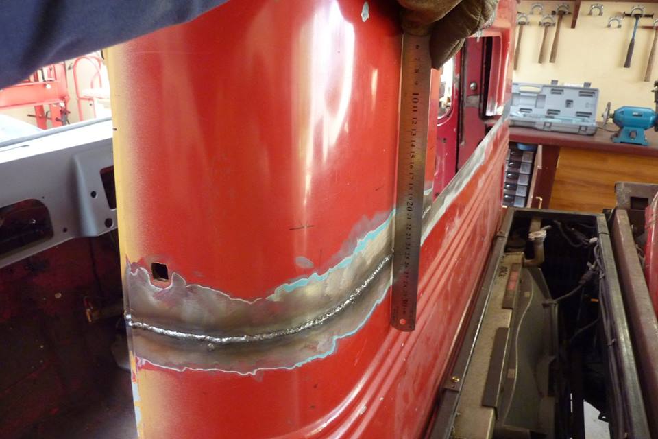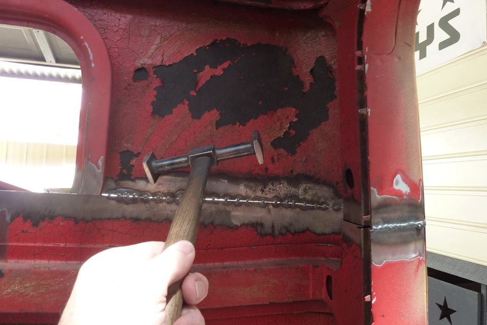 Hammering from the inside out with my arm through the window holding the flat face of the dolly against the weld and heat affected area. Doesn't need much if you have kept your weld size down with the thinner mig wire. Don't use flux core! Can see the weld is at the right height but a little dip above it. That was there before welding too so will hammer out that area.