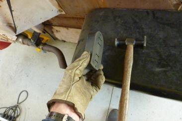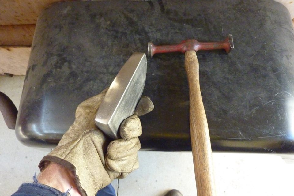 This is that single curved hammer face I made years ago. Using it in the corners to hammer outwards onto a flat faced dolly to stretch it outwards. Due to the gap I was left with, the quickest way to weld this up was using the mig with 0.6mm-0.23" wire. This was welded non stop from one end to the other putting one tack on the next while it was still red.