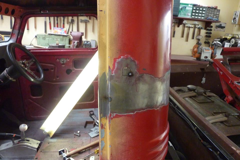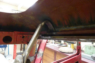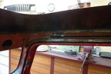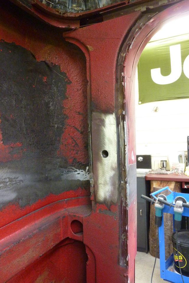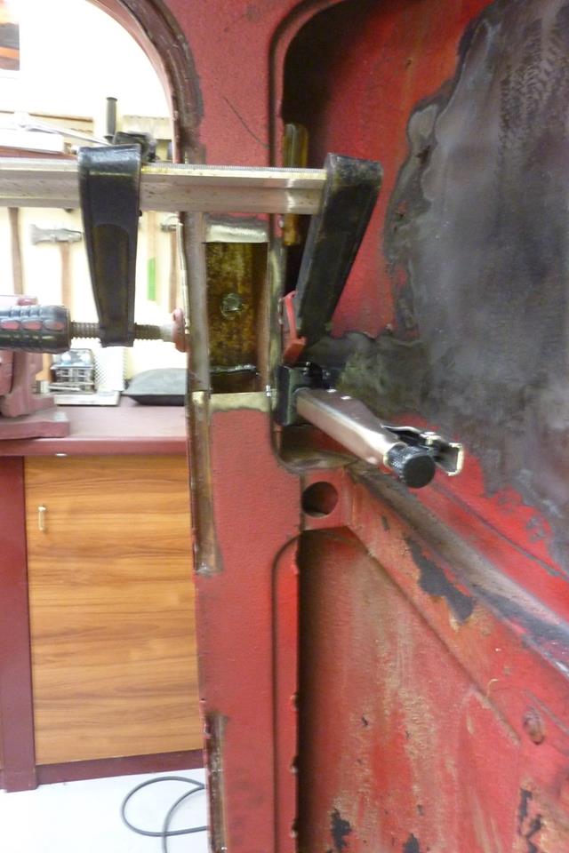 Sometimes you have to be a bit creative to align things before tacking! So both upper seat belt mounts done and the inner window frame extended and welded into place.
